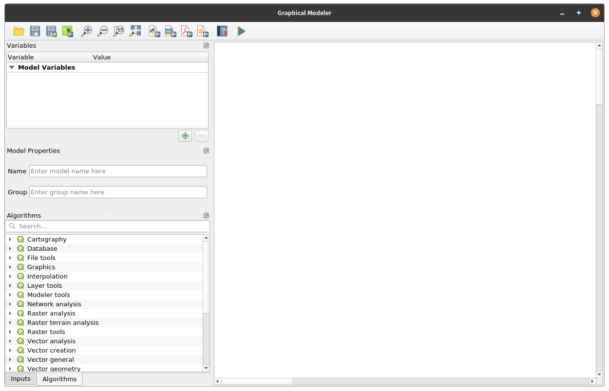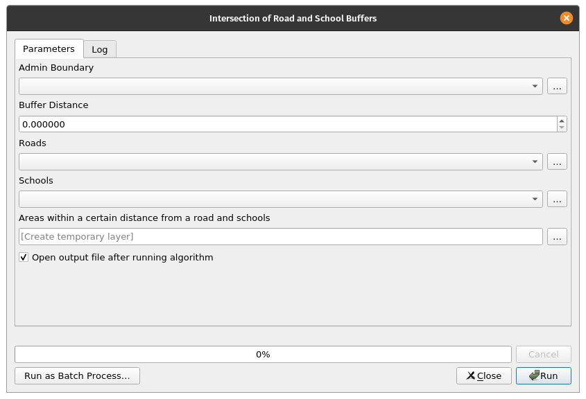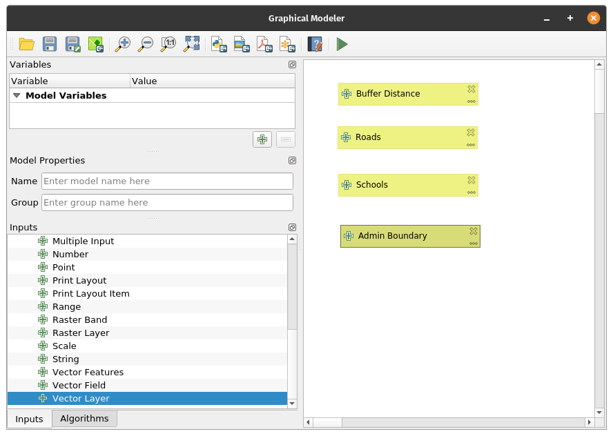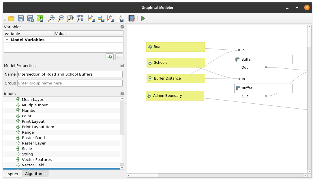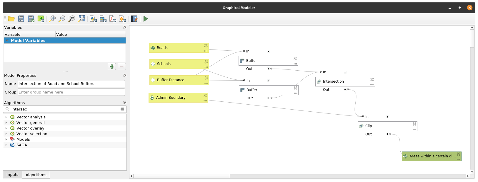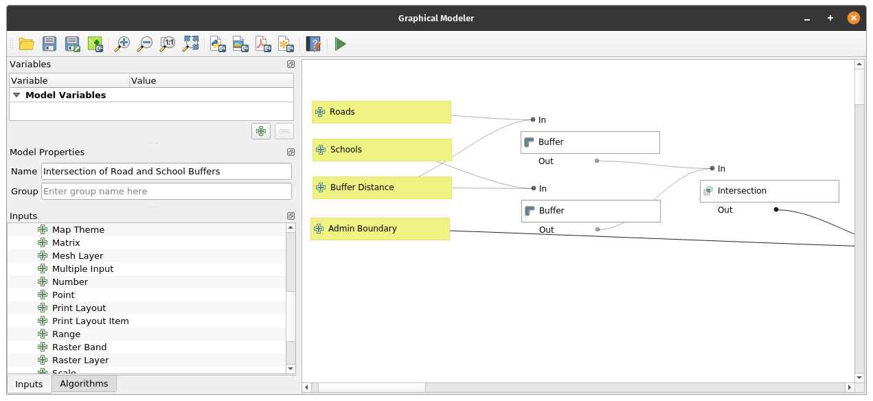 QGIS has a powerful graphical modeler that allows you to create reusable and shareable models. These models can also be converted into Python scripts easily. One of the advantages of using models is that we can easily change inputs and variables without needing to run the algorithms multiple times. For example, let’s create a simple model of our process for getting the areas within a province that are a certain area from roads and schools. Exercise 9: Creating a simple model with the graphical modeler