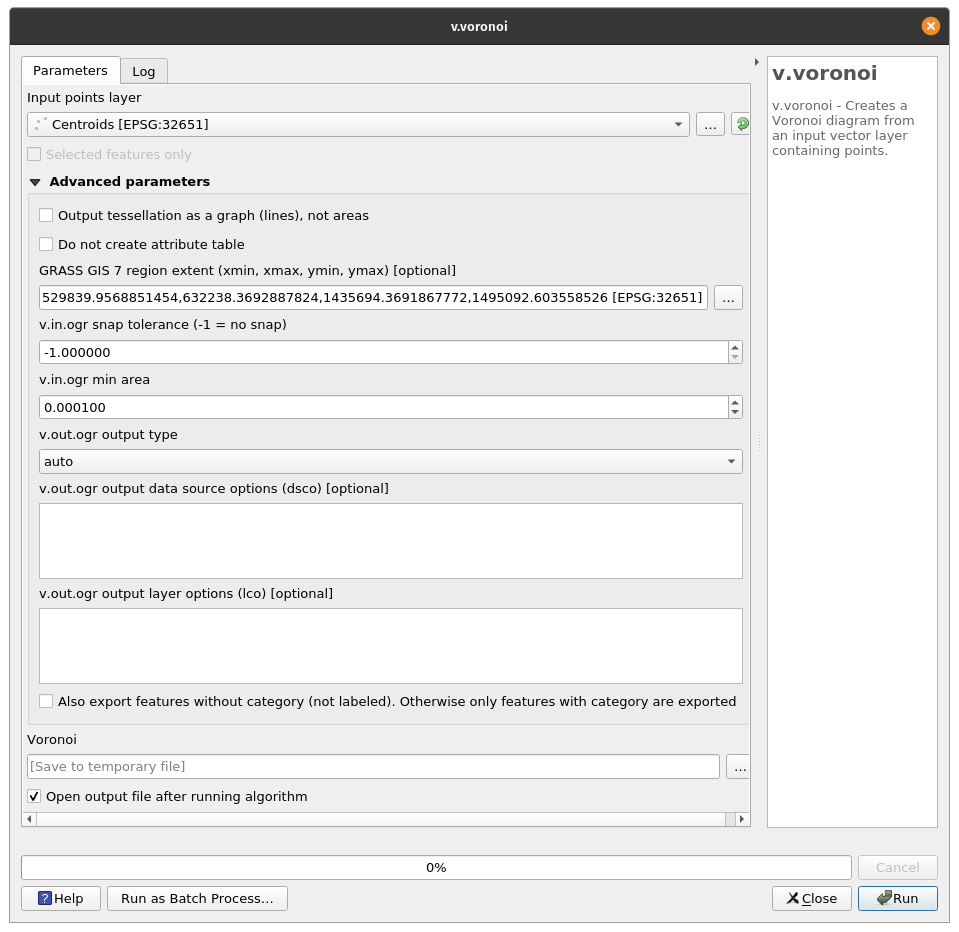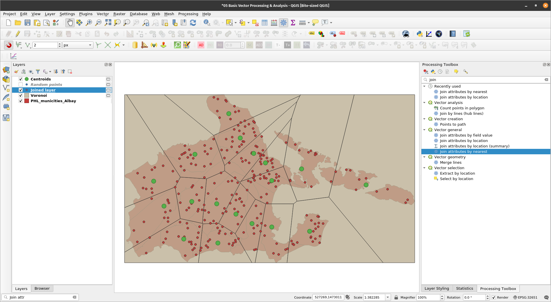 Find the points from one layer that are nearest to each point from another layerExercise 12: Voronoi polygonsAside from QGIS processing algorithms, QGIS also has access to algorithms from processing providers connected to it. These include GRASS, SAGA, Orfeo Toolbox, TauDEM, LASTools, etc. For this exercise, we’ll use the v.voronoi algorithm from GRASS GIS to generate voronoi polygons from the Centroids we generated earlier. Voronoi polygons are generated from points. If a point is inside a voronoi polygon, it means that it is nearest to the generating point of that polygon than all generating points. A possible use case of voronoi or Thiessen polygons is finding the closest cell tower to a user given the location of cell towers. For our exercise, we can use voronoi polygons to determine the random points that are closest to our city/municipality centroids.