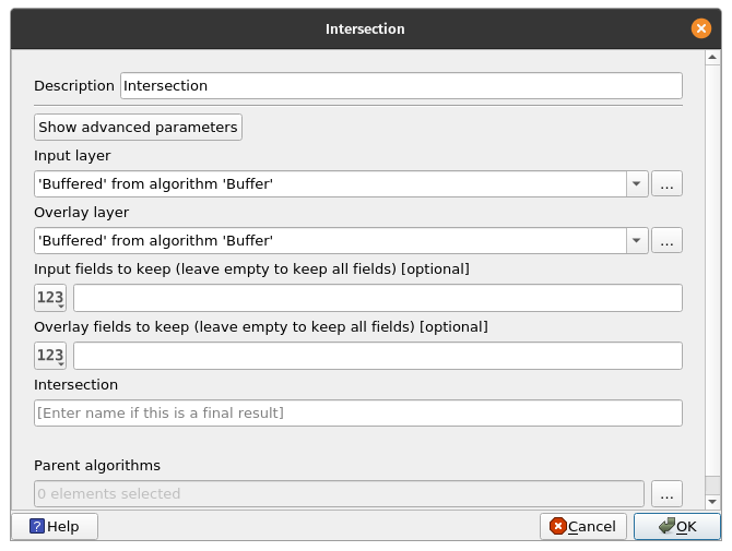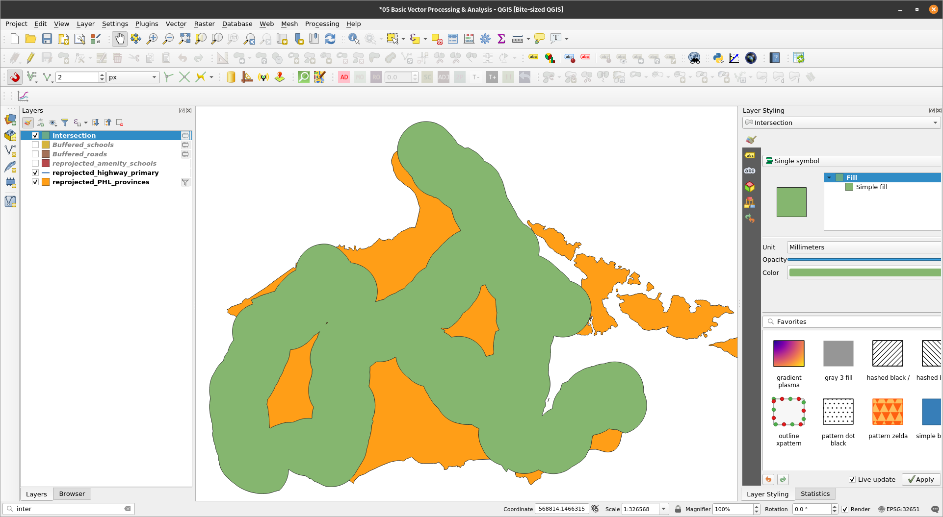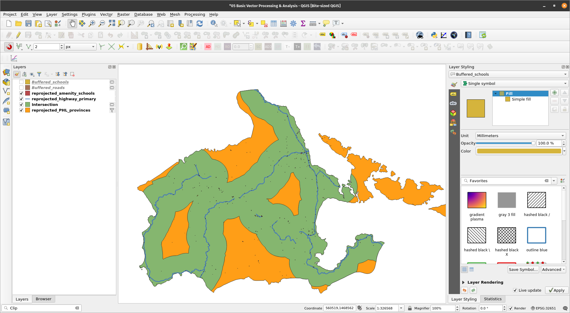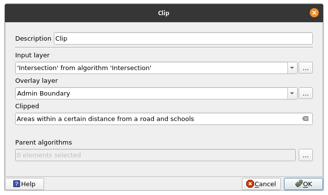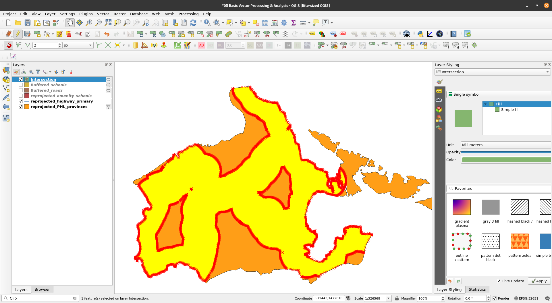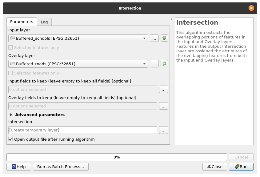 Intersecting vector layersNow that we know the areas that are 5km from each school and 5km from the roads. We can now find areas that are simultaneously within those two buffers by using the Intersection algorithm. BONUS: When to use Clip and when to use Intersection? Use a clip if you are only interested in the attributes of the base layer. Use Intersection if you want your output to have the attributes of the base layer and intersection layer. Exercise 8: Find areas within 5km of a POI and a road.The Intersection algorithm extracts the overlapping portions of features in the Input and Overlay layers. Features in the output Intersection layer are assigned the attributes of the overlapping features from both the Input and Overlay layers.