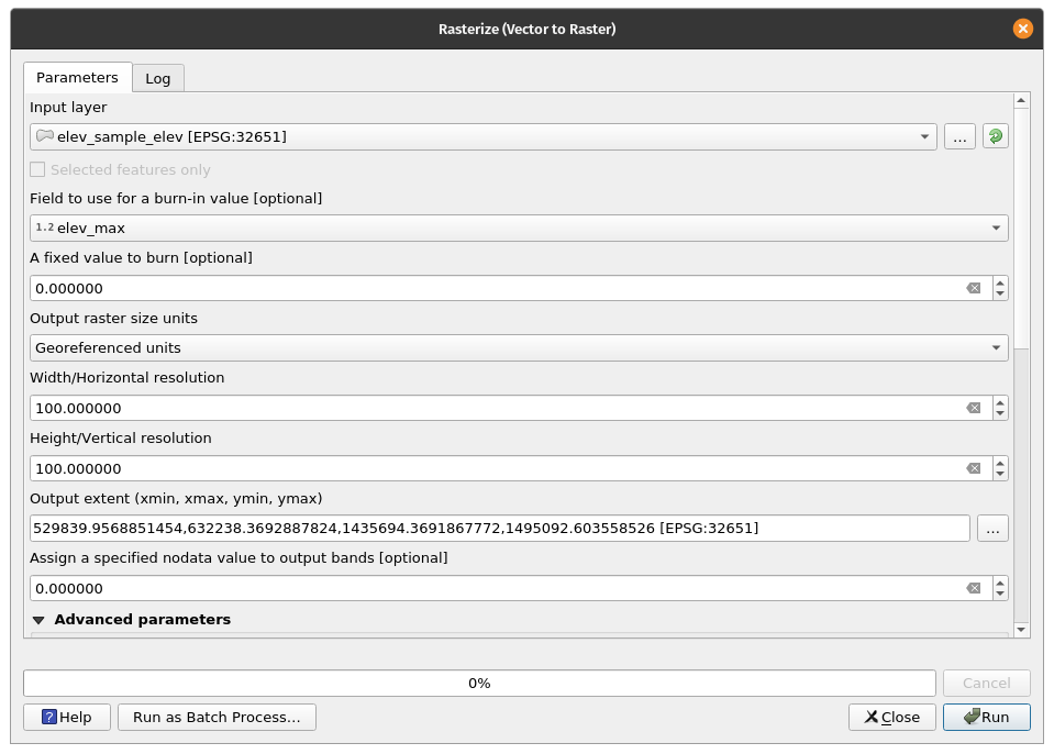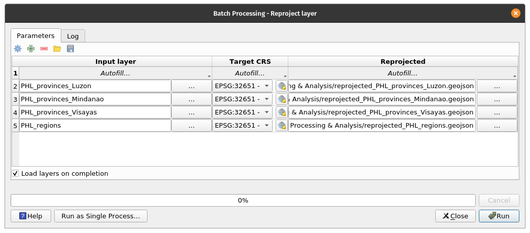 BONUS: The ability to perform batch processing is exposed for most processing algorithms. This option can normally be found in the lower left corner of a processing algorithm window. By clicking , we can run a processing algorithm for several inputs. The Batch Process window will allow users to add parameters for each run of the process. Try to reproject the remaining vector layers as a batch process. | |