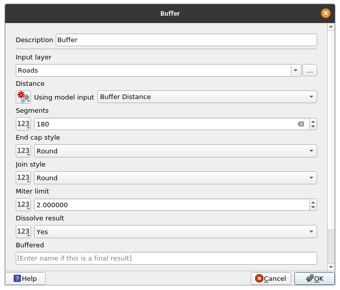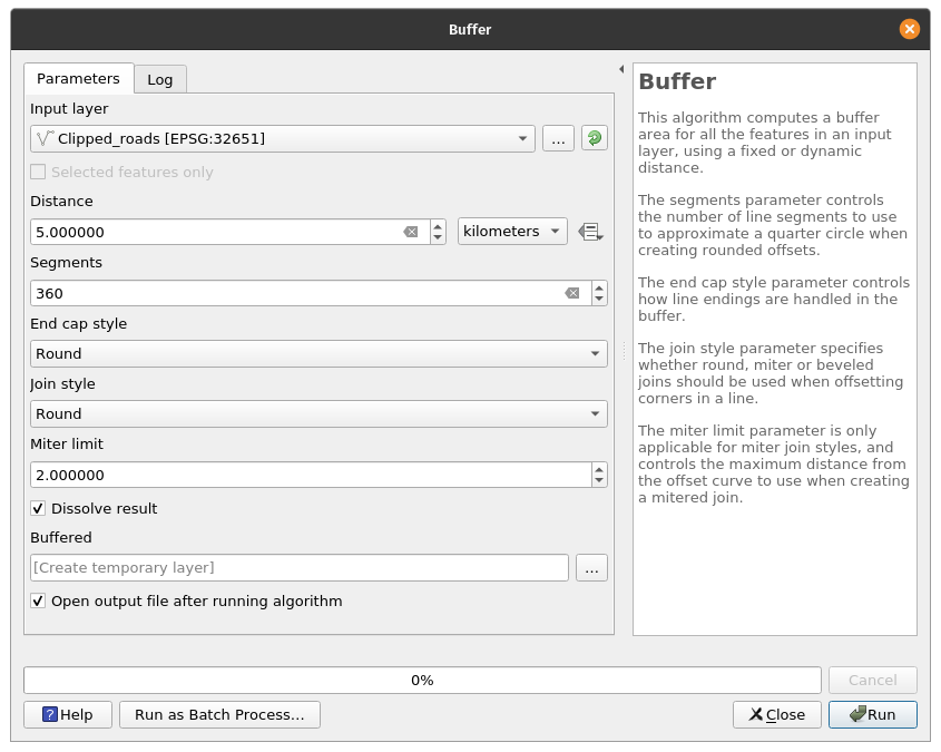 Creating buffersAnother common processing algorithm used are Buffers. This algorithm computes a buffer area for all the features in an input layer, using a fixed or dynamic distance. Buffers are an easy way to visualize nearness or inclusion of datasets. For example, we can try to find areas that are simultaneously within 5km of a road and 5km of a school by performing a buffer on the road and school layers and then running an intersection or clip algorithm on the resulting buffers. Exercise 7: Creating a 5km buffer around the schools and road layers