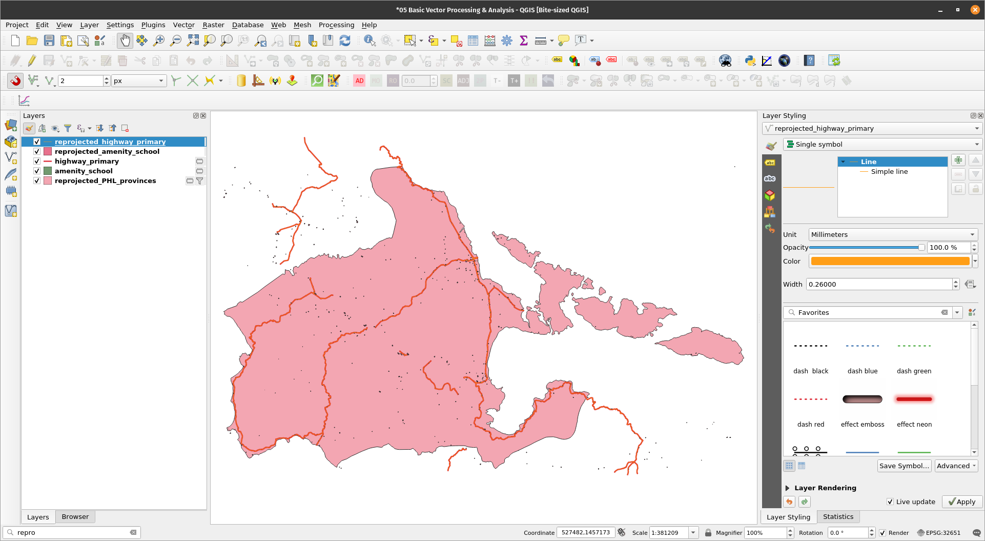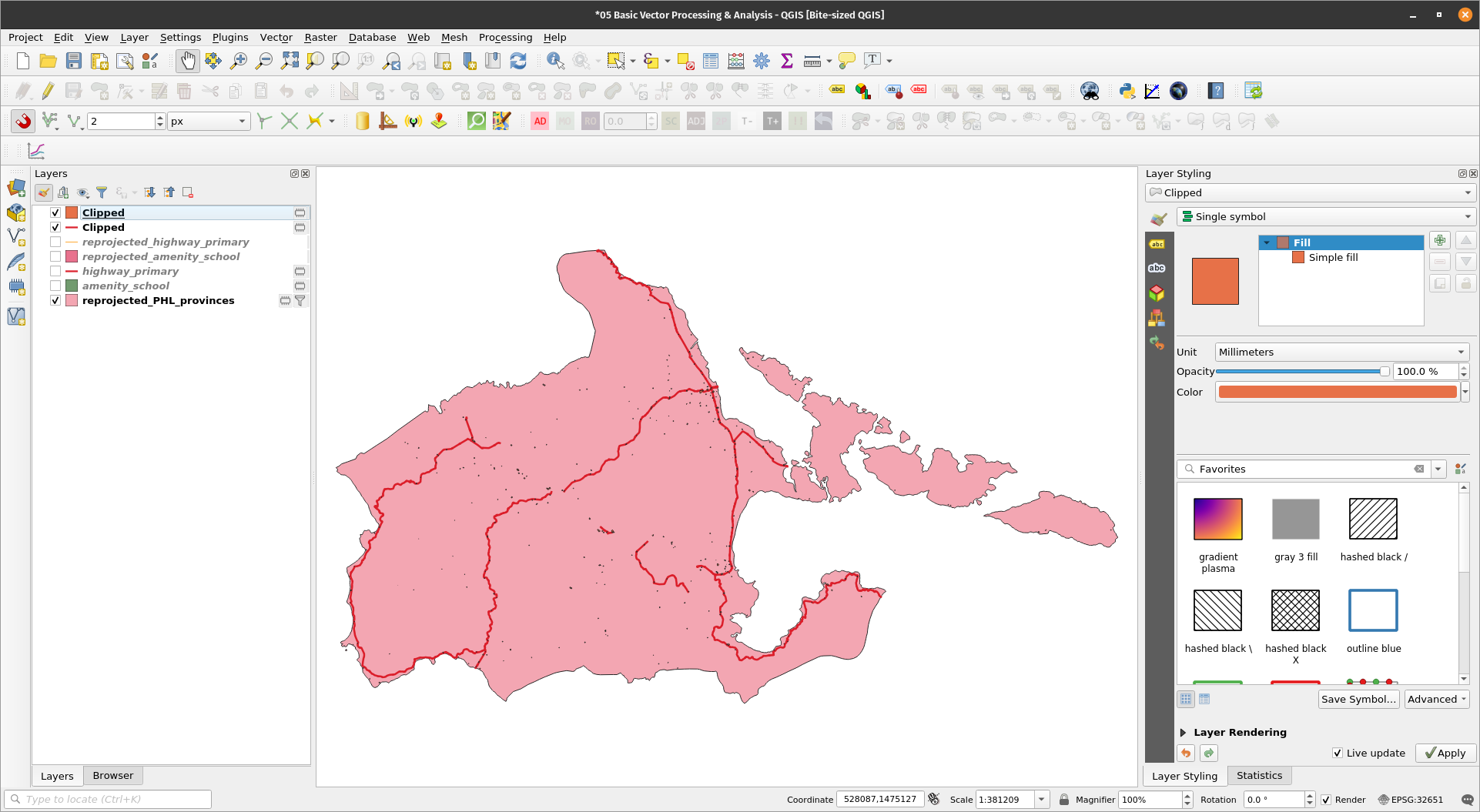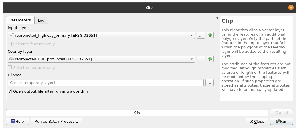 Clipping vectorsNotice that there are roads and schools located outside of the province of Albay. Since we only want the roads and schools inside the Albay feature, we can simply Clip the highway_primary and amenity_school layer with the reprojected_PHL_provinces layer. Exercise 6: Clipping the primary roads and schools vector to the province of AlbayThe Clip algorithm clips a vector layer using the features of another polygon layer. Only the parts of the features in the Input layer that fall within the polygons of the Overlay layer will be added to the resulting layer. The attributes of the features are not modified, although properties such as area or length of the features will be modified by the clipping operation. If such properties are stored as attributes, those attributes will have to be manually updated