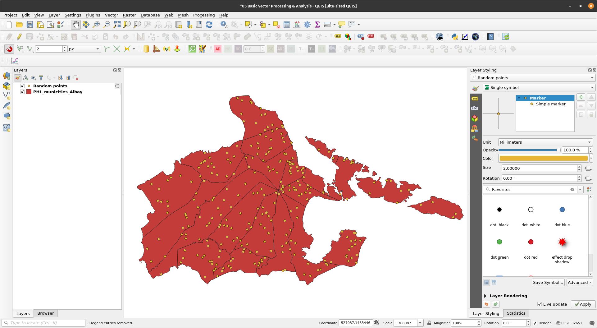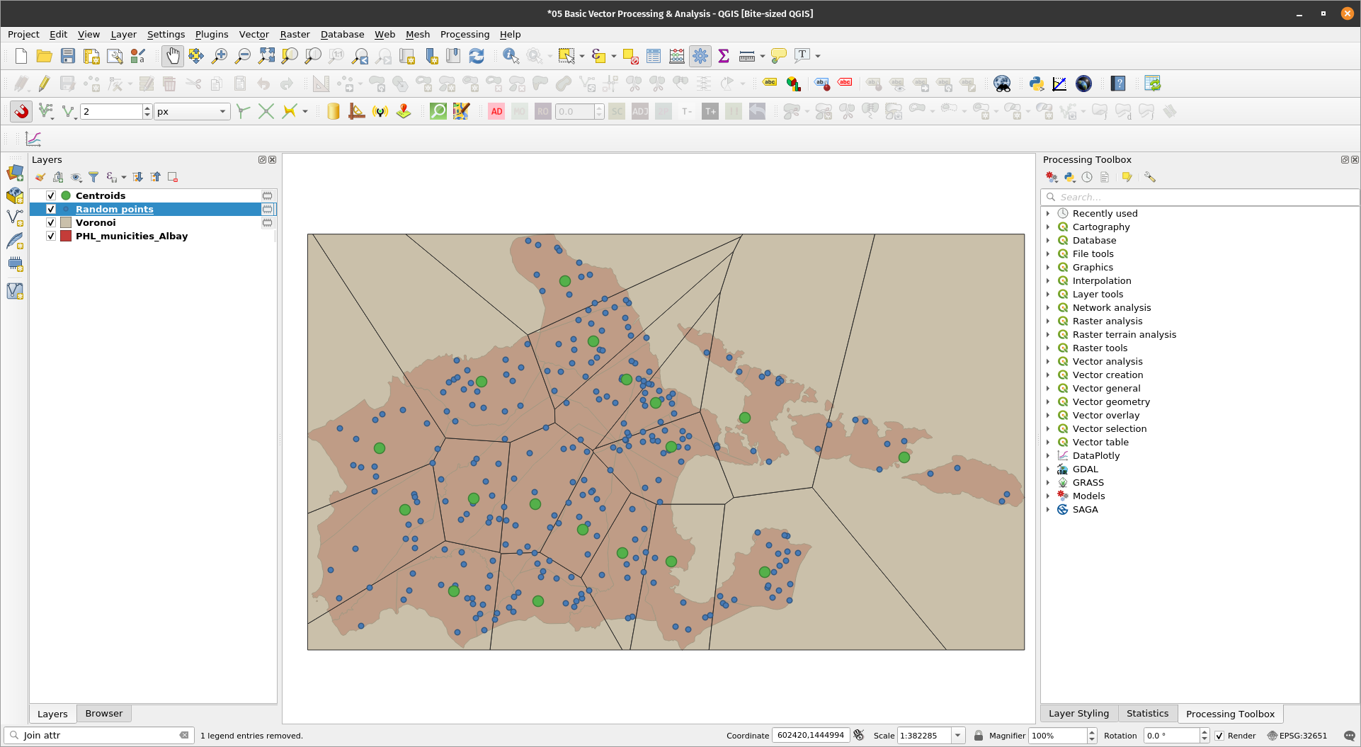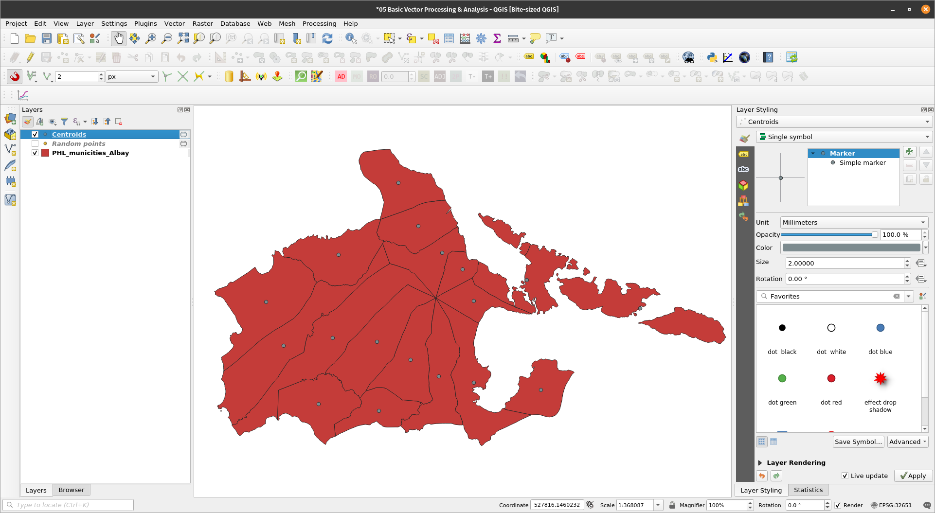 Getting centroidsExercise 11: Create a centroid layer of the PHL_municities_Albay layerThe Centroids algorithm creates a new point layer, with points representing the centroid of the geometries in an input layer. The attributes associated with each point in the output layer are the same ones associated with the original features.