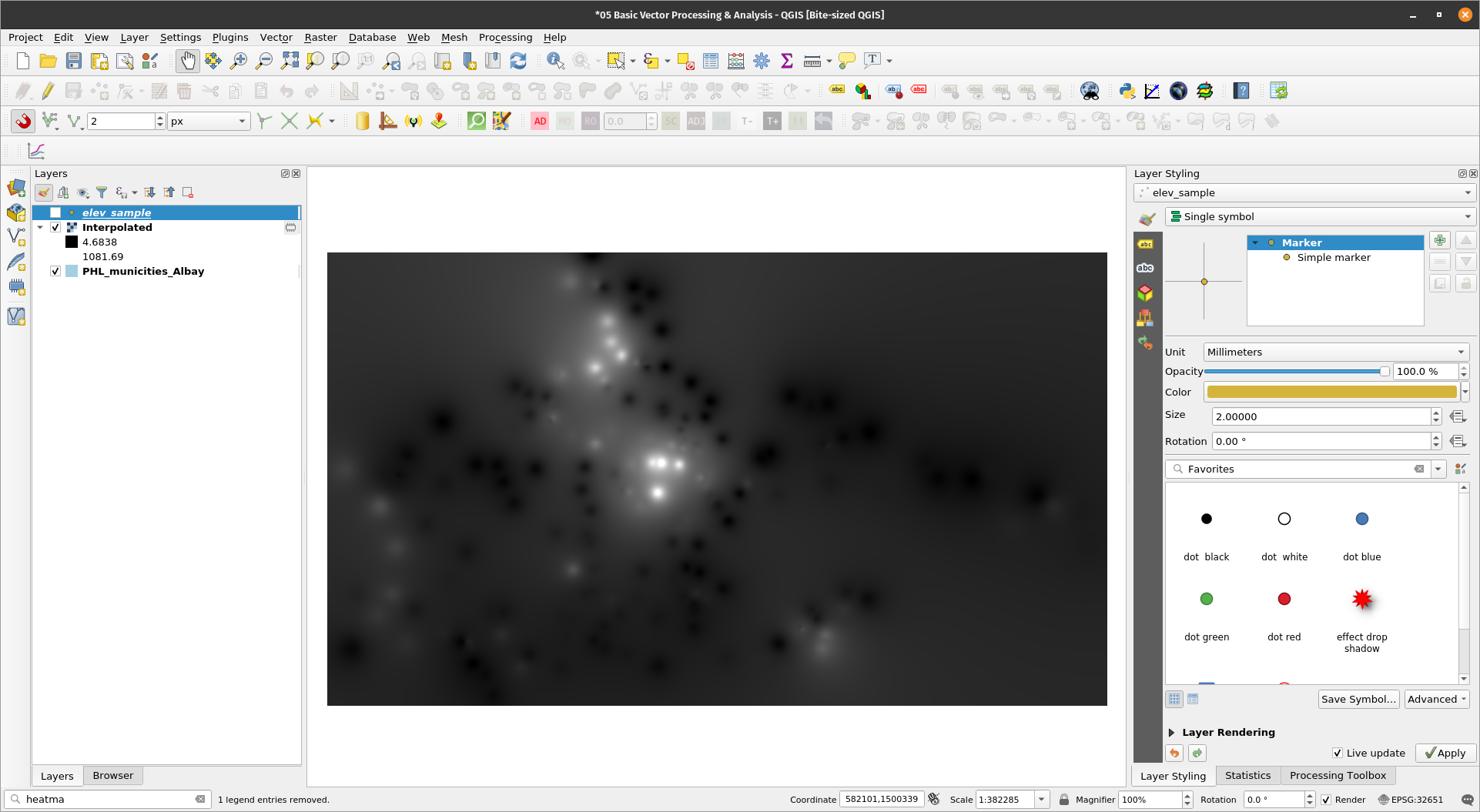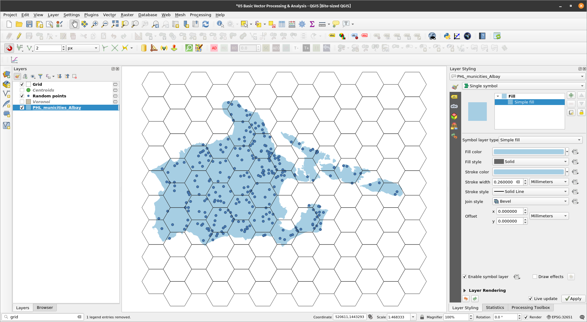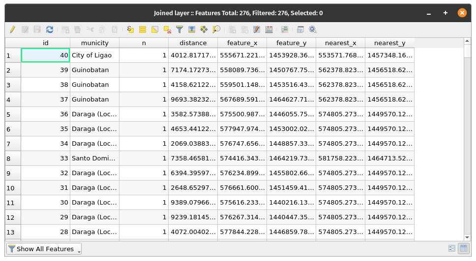Getting centroidsExercise 11: Create a centroid layer of the PHL_municities_Albay layerThe Centroids algorithm creates a new point layer, with points representing the centroid of the geometries in an input layer. The attributes associated with each point in the output layer are the same ones associated with the original features.