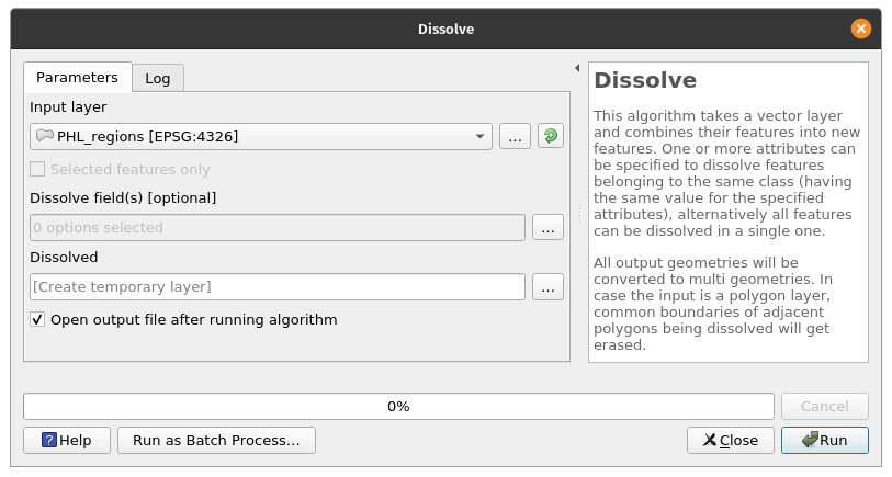 Dissolving vectorsThe act of dissolving layers involves merging or combining features (geometries) based on their attributes. The Dissolve algorithm in QGIS Processing takes a vector layer and combines their features into new features. One or more attributes can be specified to dissolve features belonging to the same class (having the same value for the specified attributes), alternatively all features can be dissolved in a single one. All output geometries will be converted to multi geometries. In case the input is a polygon layer, common boundaries of adjacent polygons being dissolved will get erased. Exercise 2: Dissolving the merged provincial polygon layer to create a regional polygon layerFor this exercise, we would like to create a regional polygon layer by dissolving the PHL_provinces layer based on its region or psgc_region attributes.