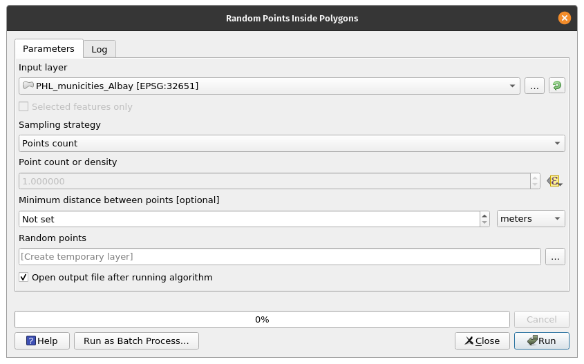 Generating random points inside polygonsExercise 10: Generate random points inside the PHL_municities_Albay layerThe Random Points Inside Polygon algorithm allows users to generate random points inside polygons. The number of points can be set by a point count or point density value. This value, as with other algorithm parameters, can be defined by a data-defined override.