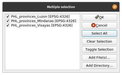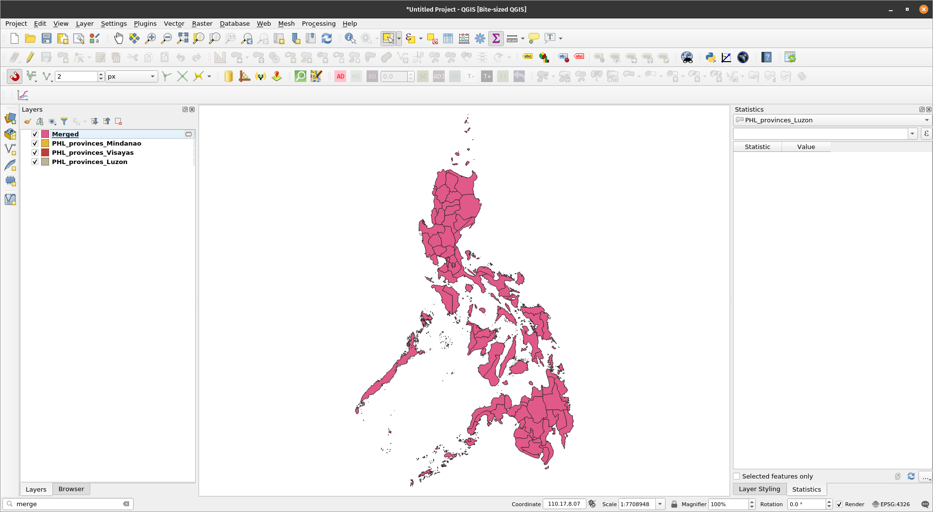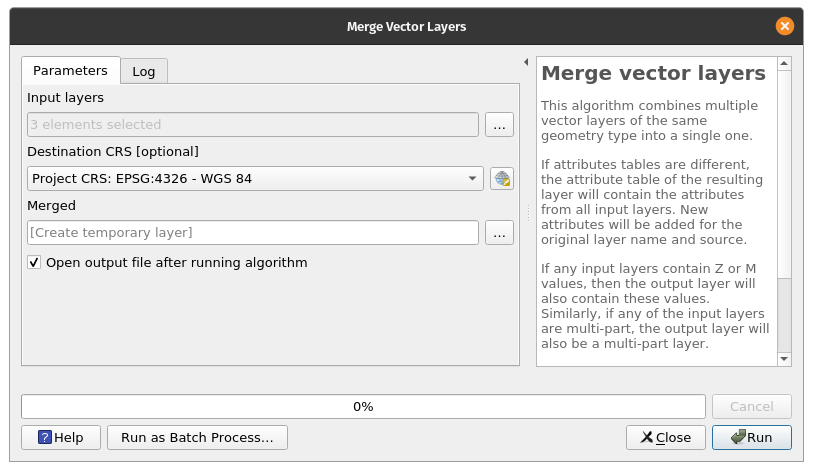 There are a variety of algorithms for working with vectors that can be found in QGIS’s built-in Processing provider. Aside from the core QGIS processing algorithms, QGIS also has access to algorithms provided by other processing providers such as applications like GRASS, SAGA, Orfeo Toolbox and processing plugins such as Whitebox Tools. QGIS algorithms can also be extended through the use of Python and R. Merging vectorsMerging vectors is a common vector operation that combines several vector layers into one vector layer. This is useful when you want to create a larger dataset from multiple smaller datasets. The Merge vector layers algorithm of QGIS combines multiple vector layers of the same geometry type into a single one. If attributes tables are different, the attribute table of the resulting layer will contain the attributes from all input layers. New attributes will be added for the original layer name and source. Exercise 1: Merge the Luzon, Visayas, and Mindanao polygon layers to create a single Philippines polygon layer