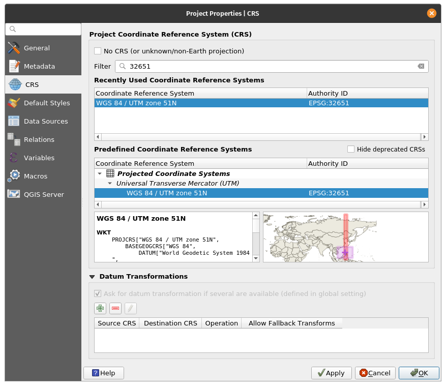 BONUS: Change the project CRS by clicking in the status bar found at the bottom right of the User Interface. Change the project CRS to EPSG:32651. | |