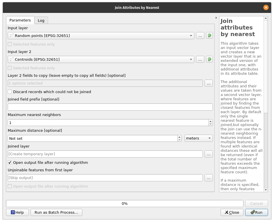 Exercise 13: Join attributes by nearestQGIS also has a built-in algorithm to Join attributes by nearest. This algorithm takes an input vector layer and creates a new vector layer that is an extended version of the input one, with additional attributes in its attribute table. The additional attributes and their values are taken from a second vector layer, where features are joined by finding the closest features from each layer. By default only the single nearest feature is joined,but optionally the join can use the n-nearest neighboring features instead. If multiple features are found with identical distances these will all be returned (even if the total number of features exceeds the specified maximum feature count).