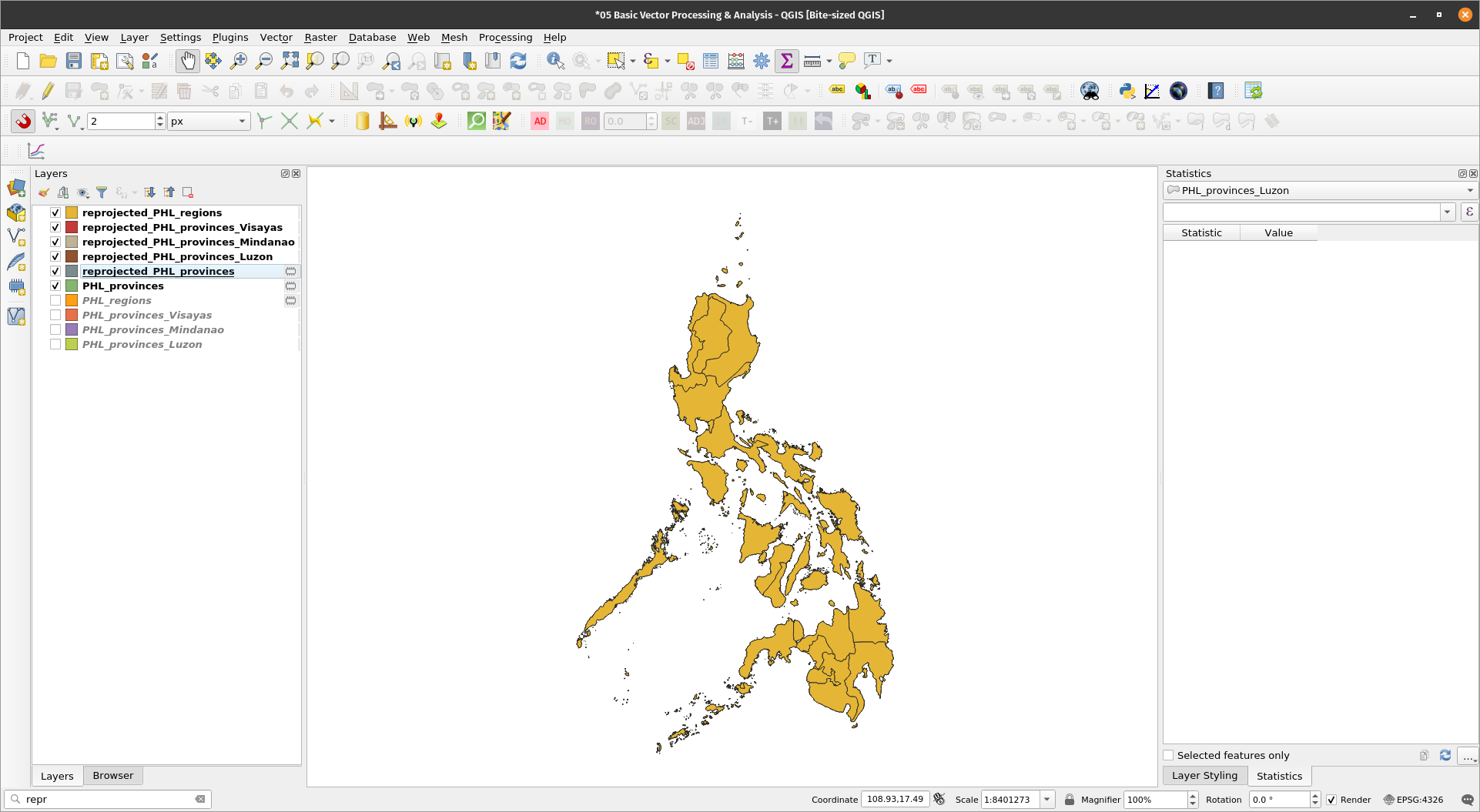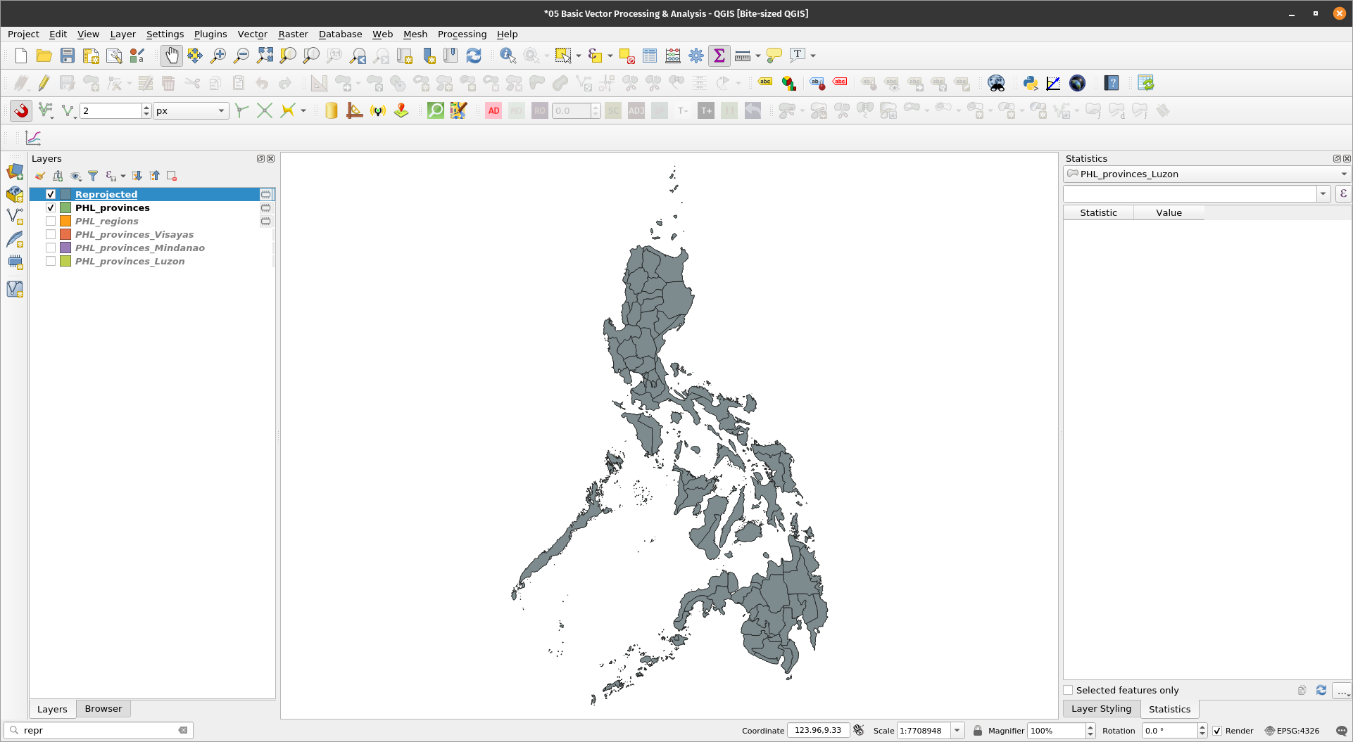 Splitting vectorsIf we can merge vectors, it’s only natural that we can split vectors as well. For this exercise, let’s split the reprojected_PHL_regions layer into individual region layers. Exercise 4: Splitting the regional polygon layer into individual region polygonsThe Split vector layer algorithm takes a vector layer and an attribute and generates a set of vector layers in an output folder. Each of the layers created in that folder contains all features from the input layer with the same value for the specified attribute. The number of files generated is equal to the number of different values found for the specified attribute. NOTE: This algorithm respects the default vector format settings under the Processing toolbar. The file format of the output (split) files will use the default vector format.