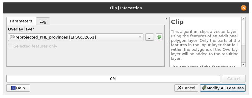 BONUS: Notice that there are areas that go beyond the boundaries of the province? What if I want to include only the areas within the province? We can perform another Intersection between the Intersection layer and the reprojected_PHL_provinces layer. For certain vector algorithms, QGIS allows for in-place editing. This means that the algorithm will not create a new output but edit the input layer instead.