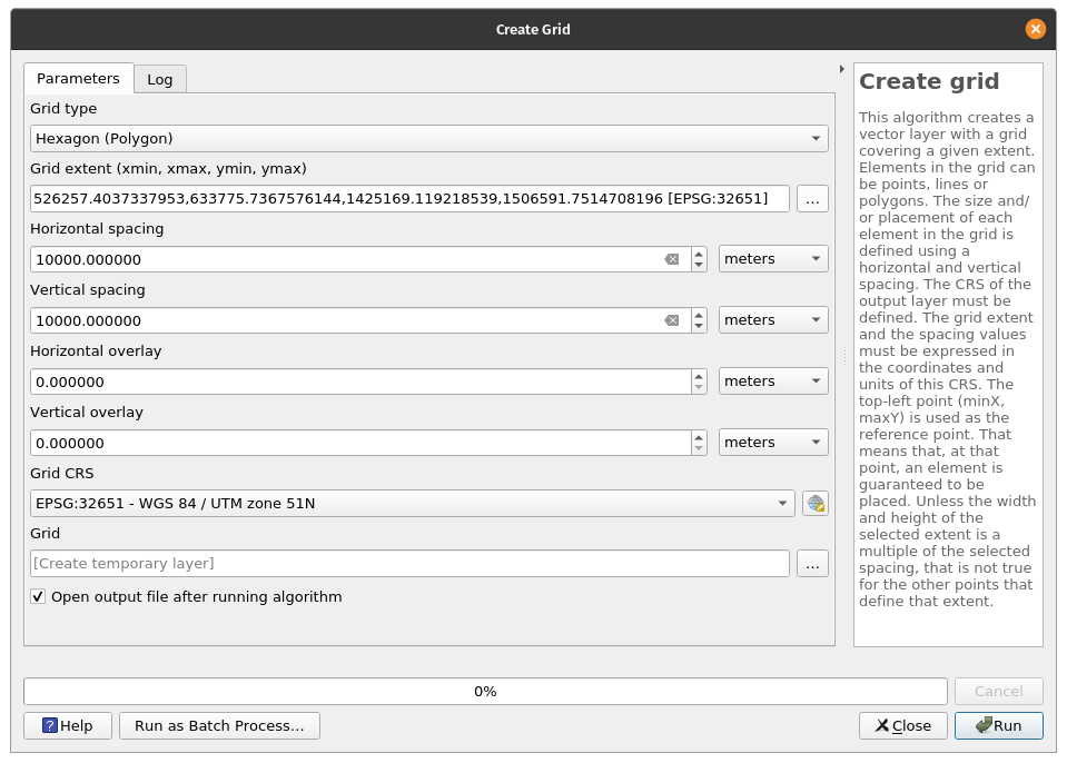 Creating gridsExercise 14: Generating grids in QGISQGIS also has an algorithm to generate grids. These grids can be made up of points, squares, diamonds, or hexagons. In this exercise, let’s create a hex grid -- a very common and popular means of visualizing data.